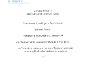 Actualités Cérémonie du 8 mai St-Denis-lès-Rebais Invitation pour la cérémonie de l'armistice du 8 mai Date de publication de la page et auteur de publication Créé le : 28/04/2026 - Mis à jour le : 28/04/2026, par Saint-Denis-lès-Rebbais Saint-Denis-lès-Rebais Précédent Retour à la liste Suivant