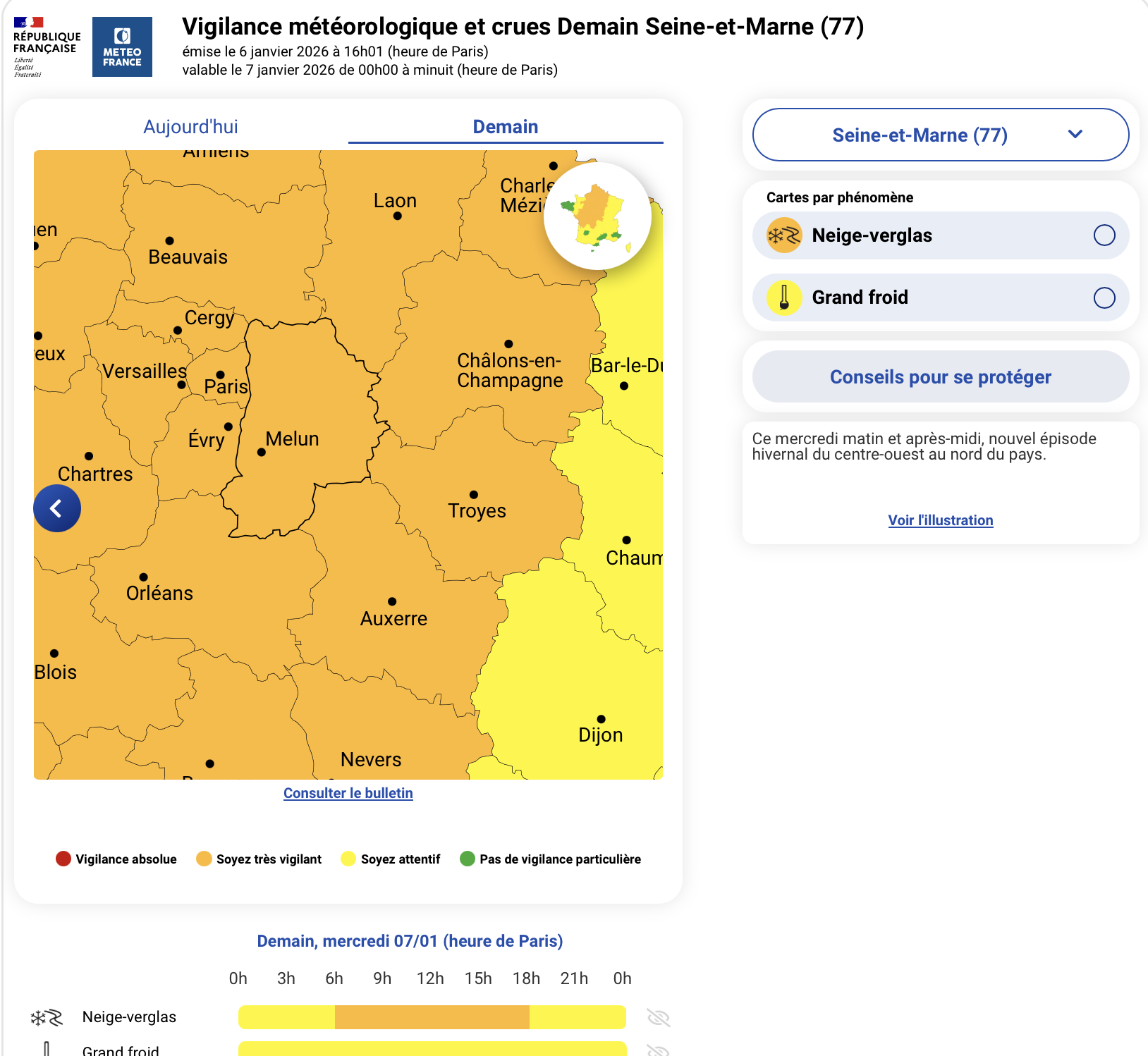 Vie pratique Vigilance pour le 7 janvier Vigilance météorologique pour le 7 janvier 2026 Vigifrance Attention Vigilance orange pour neige et verglas concernant la Seine-et-Marne demain 7 janvier 2026 Date de publication de la page et auteur de publication Créé le : 6/01/2026, par Profit Serge Précédent Retour à la liste Suivant